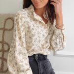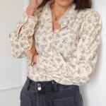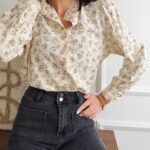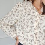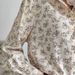 Motif floral gris bleuté, dentelle au niveau du cou et des poignets