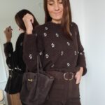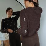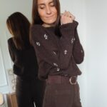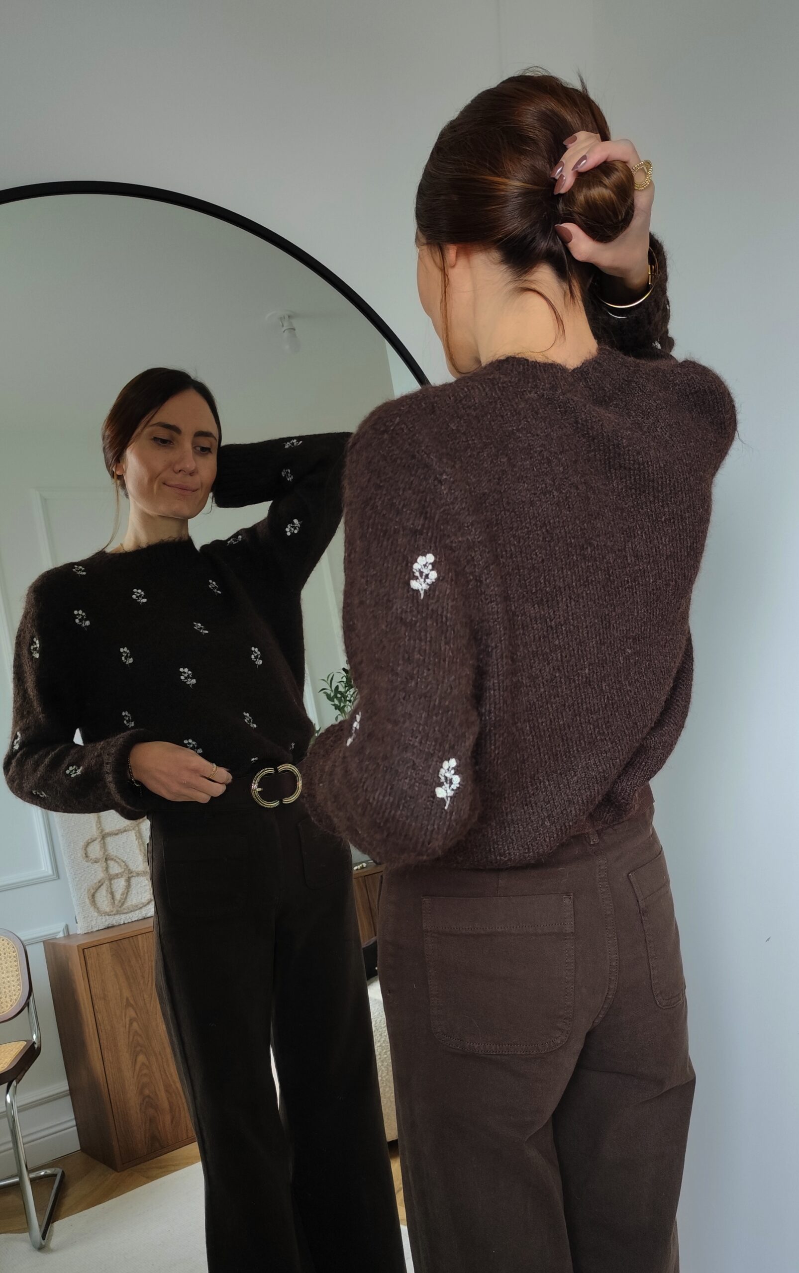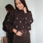 Pull chocolat, fleurs brodées sur le devant et sur les manches