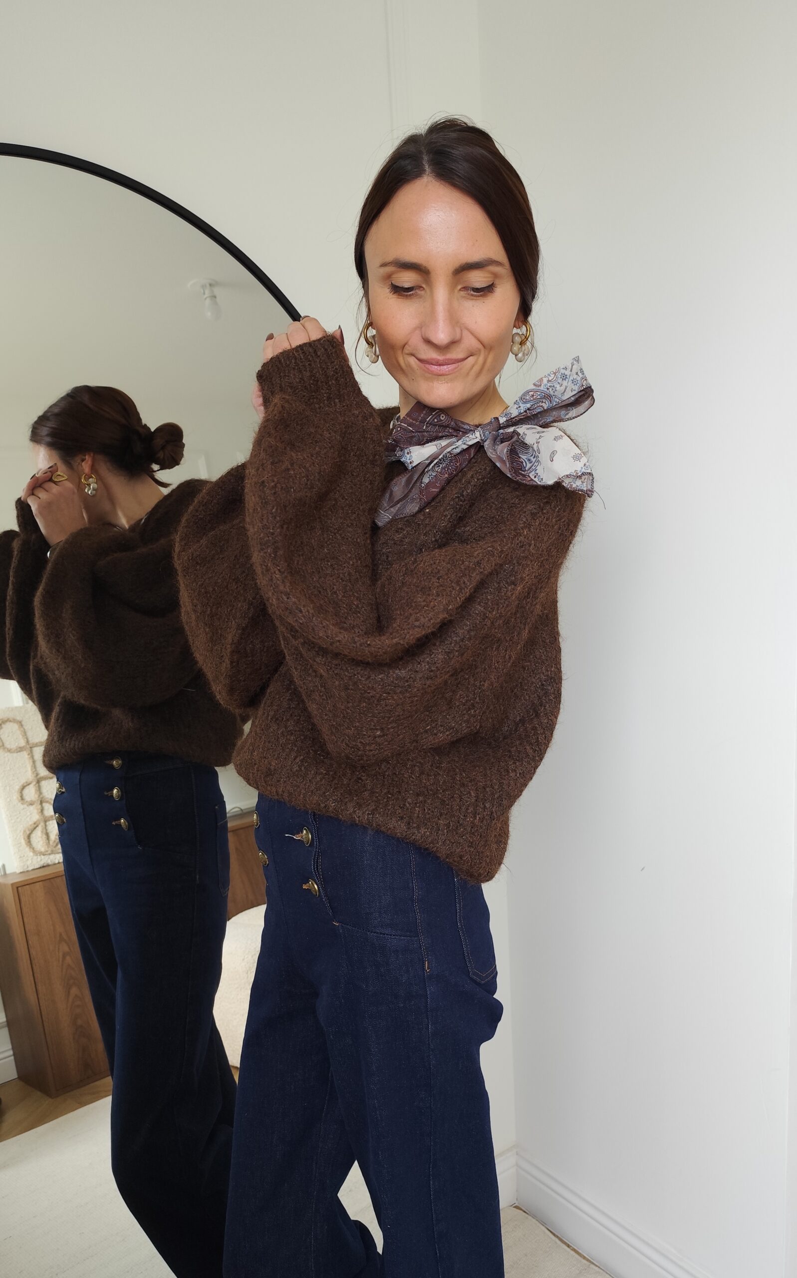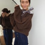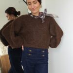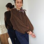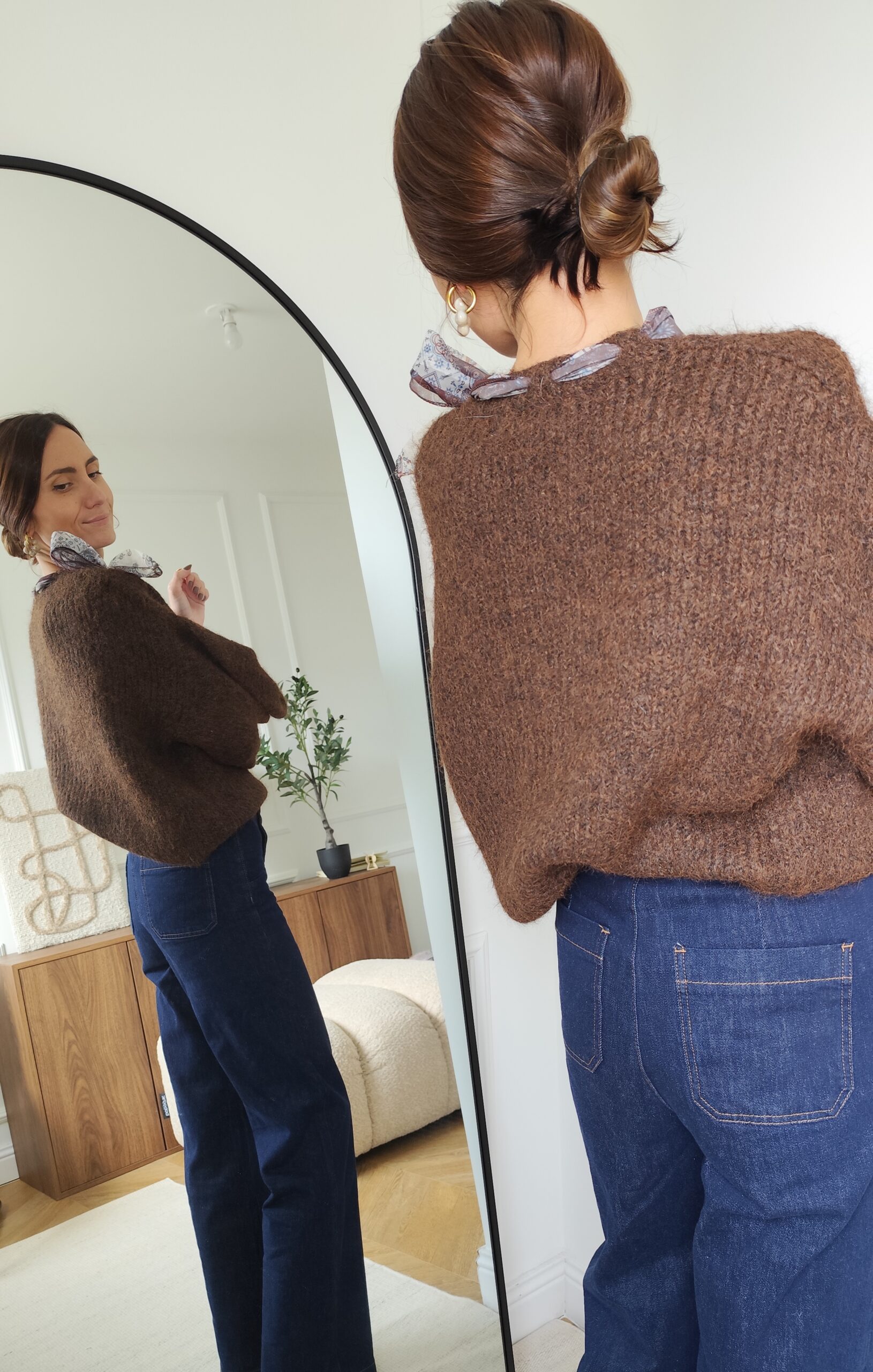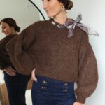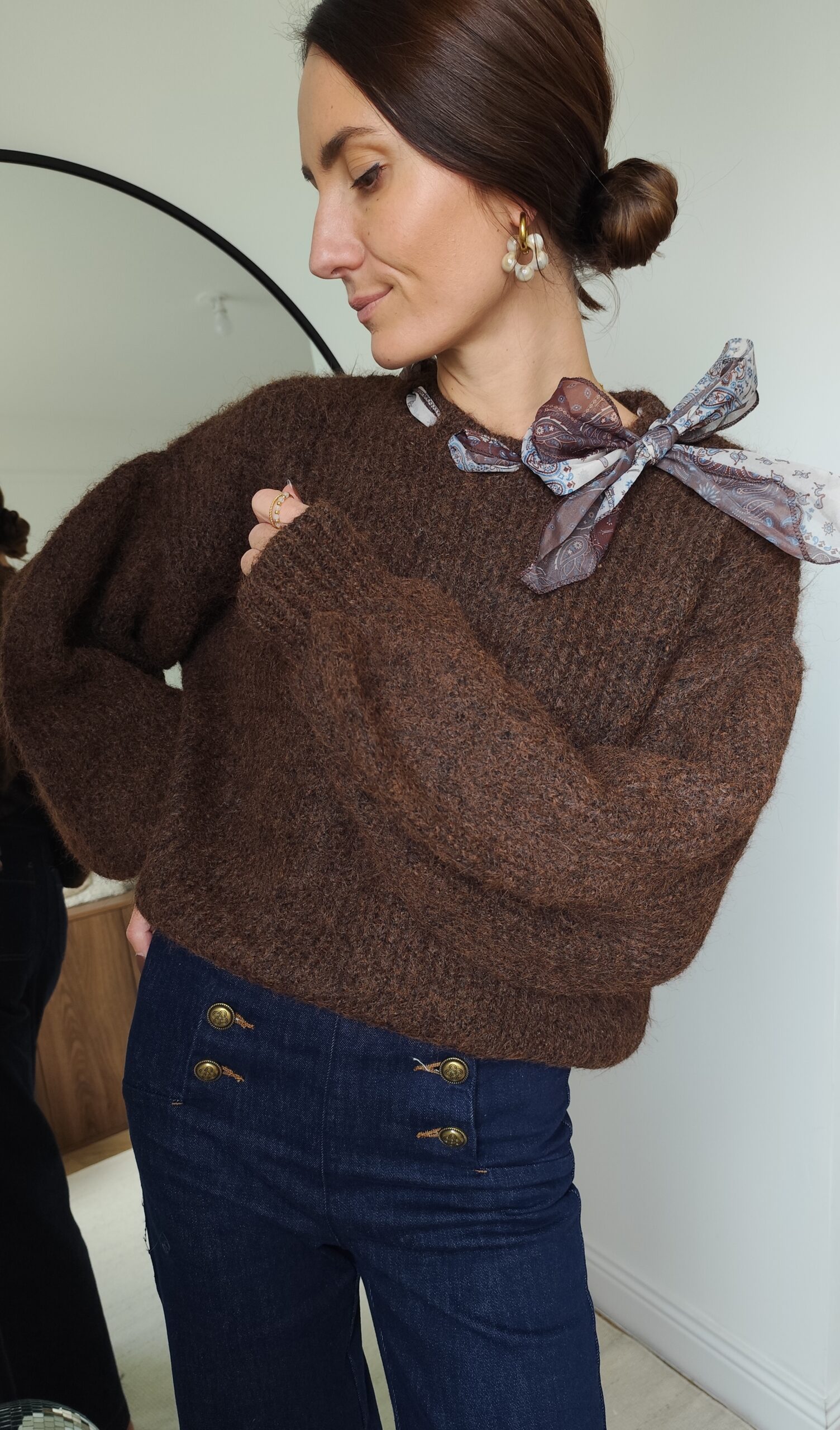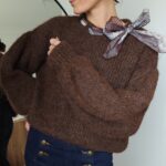 Pull chocolat avec ruban satiné au niveau de l’encolure